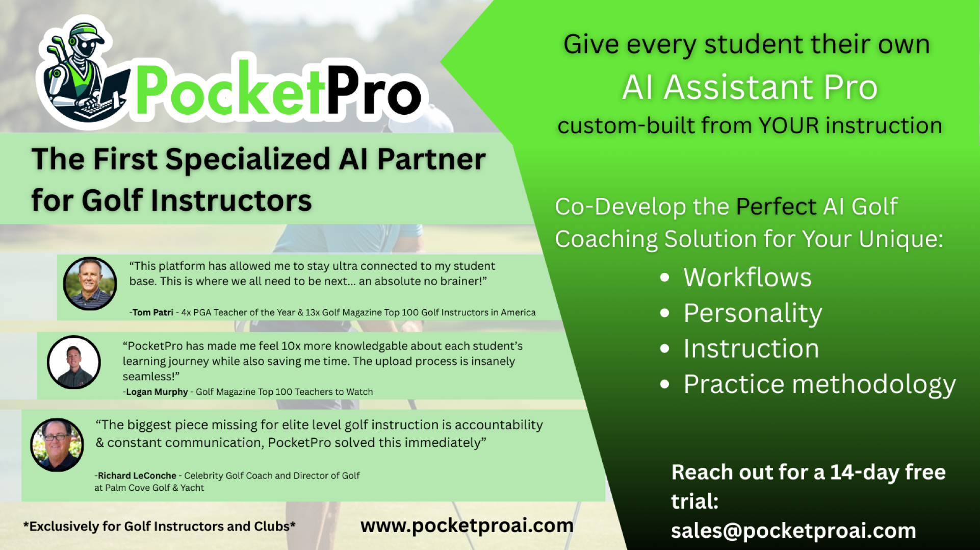Tom does private golf instruction, single and multi-day golf schools and can customize any golf lesson needs based on location and availability. He is also available for Public Speaking Engagements, Corporate Outings, and VIP Play Dates in the US and abroad. His company TP GOLF even offers an ON LINE VIDEO ACADEMY making him available 24/7/365 to anyone anywhere on the planet!